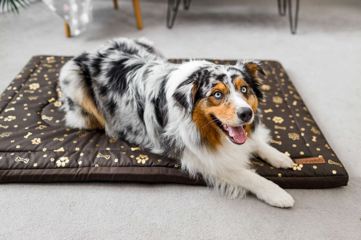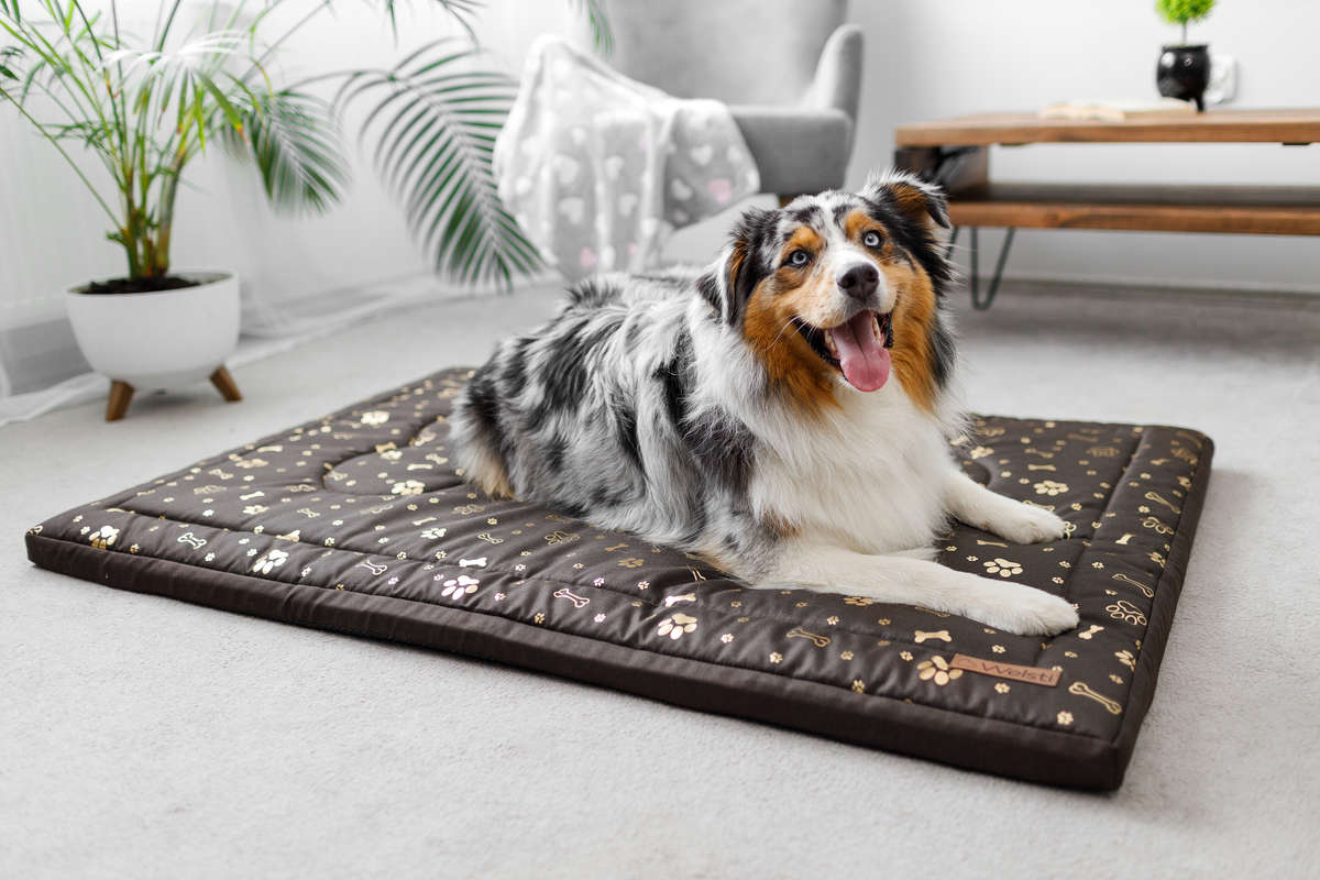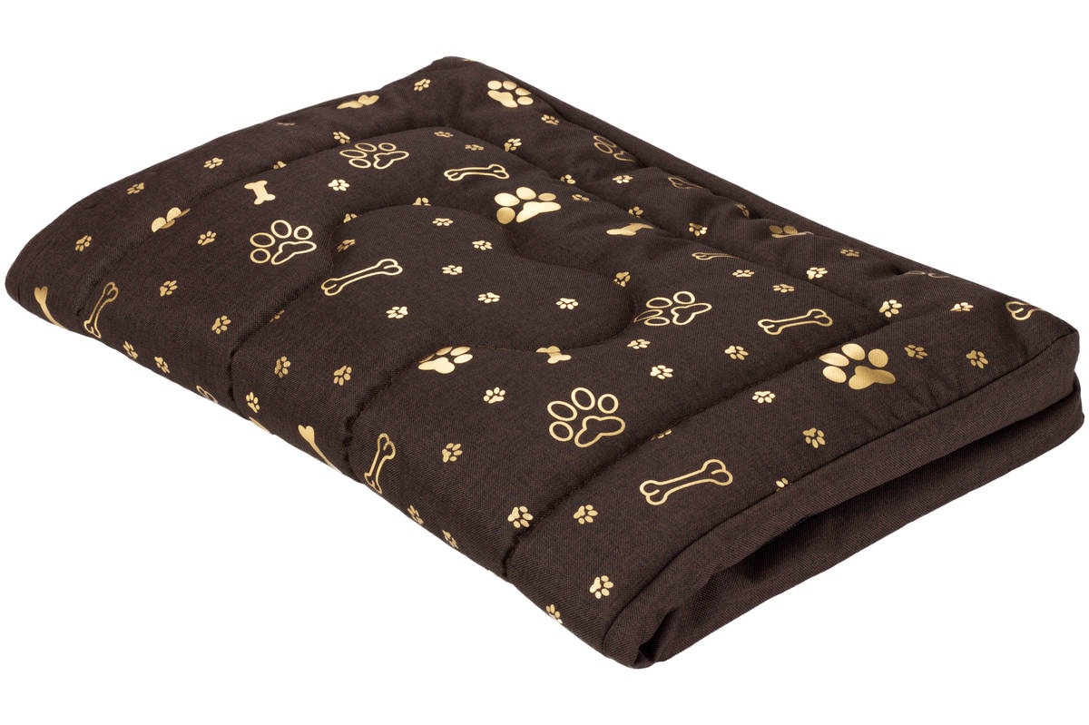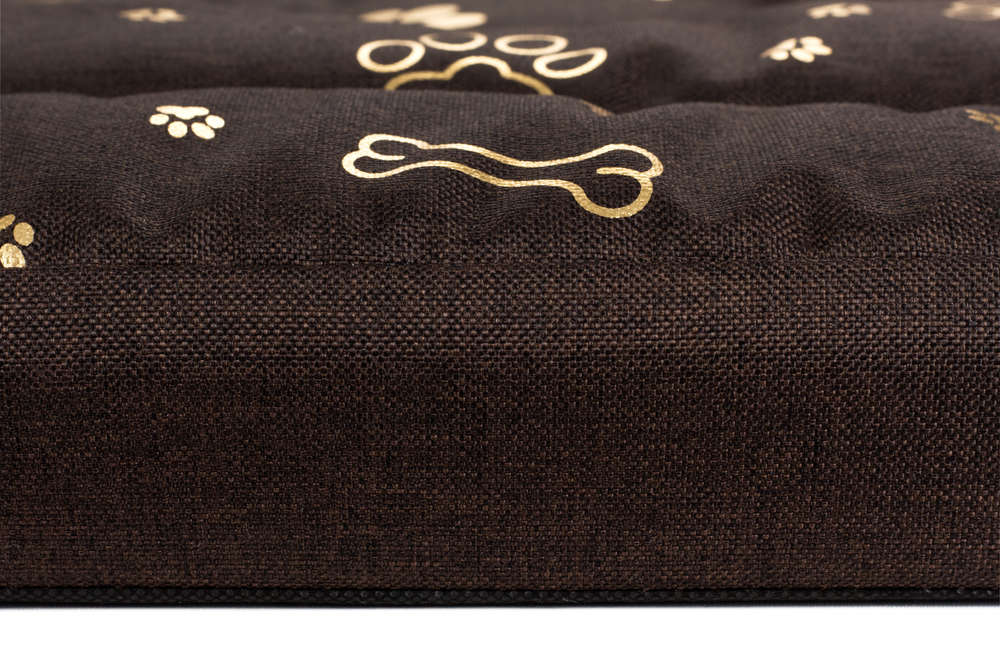 Legowisko materac dla psa Welsti brązowy złote kości i łapki XL 130x90 antypoślizgowy