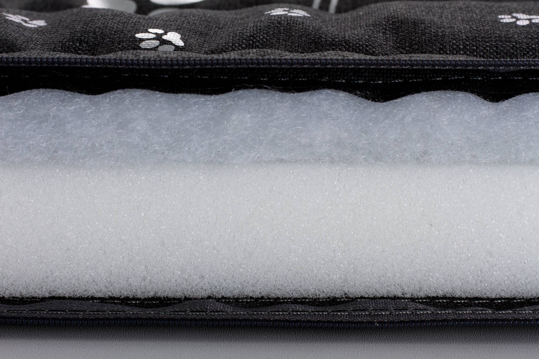 Od góry 2,5cm miękkiej i sprężystej owaty, a pod nią pianka pierwszego gatunku o grubości 3cm. Takie połączenie sprawia że legowisko jest jednocześnie miękkie i nie ubija się szybko trzymając swój kształt.