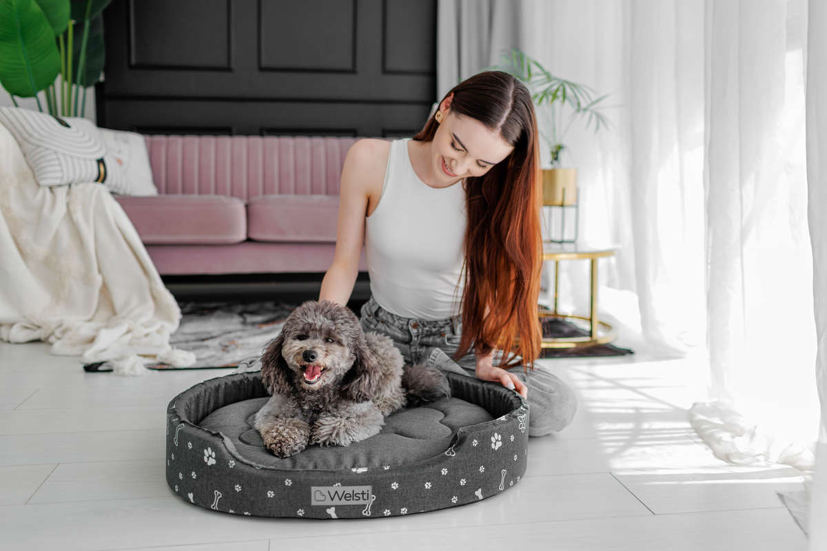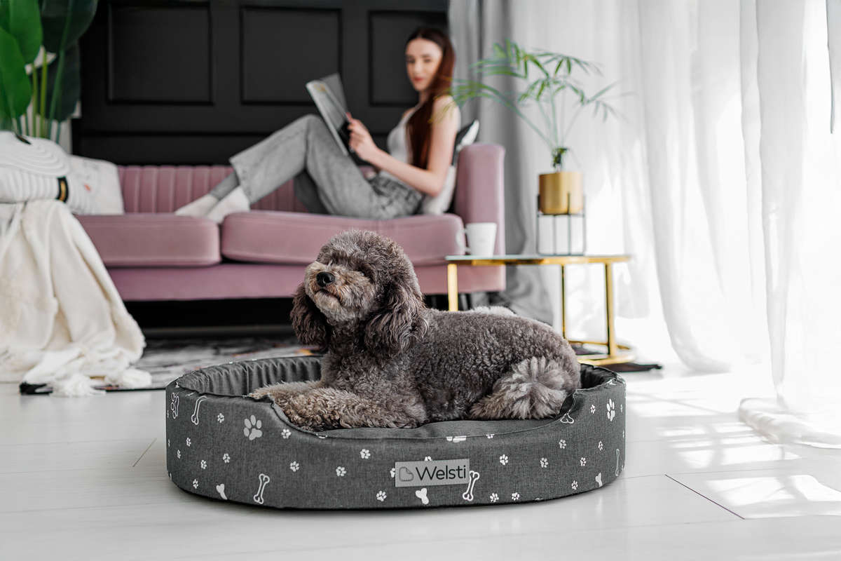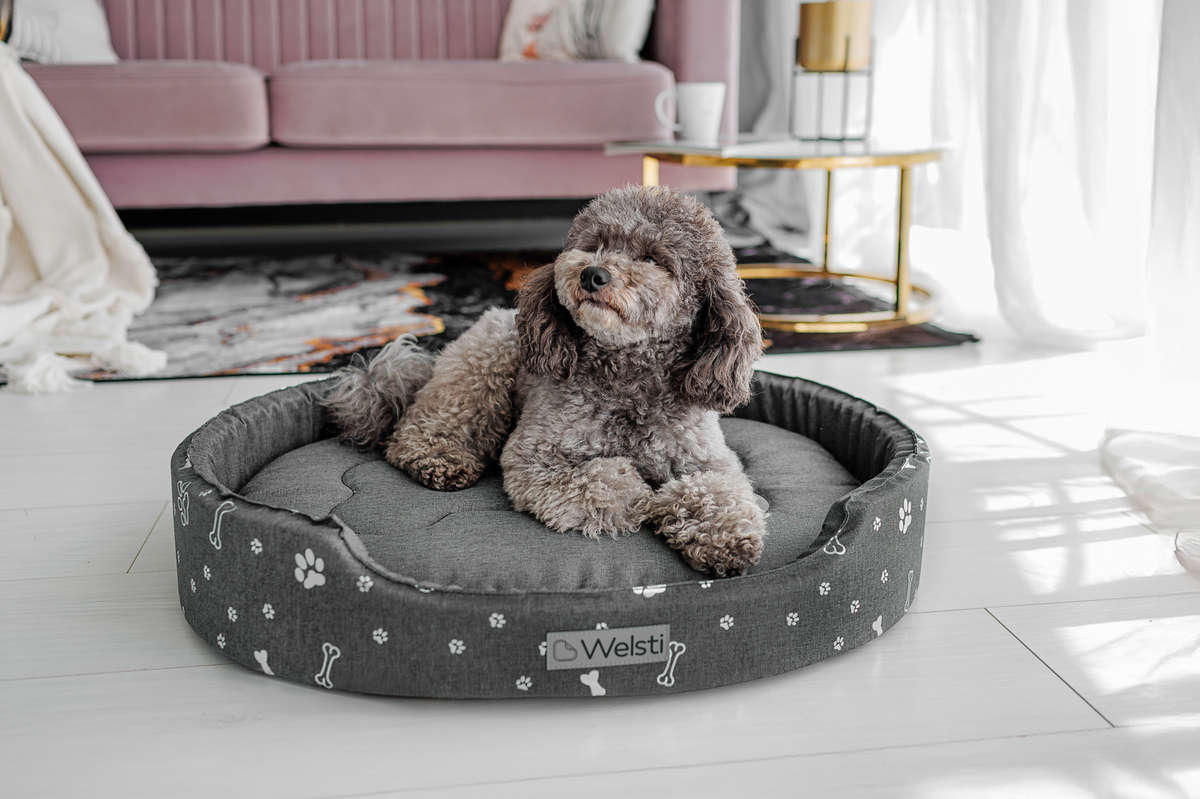 Owalne legowisko kojec dla psa Welsti ciemny szary srebrne kości i łapki L 68x55 wigofil