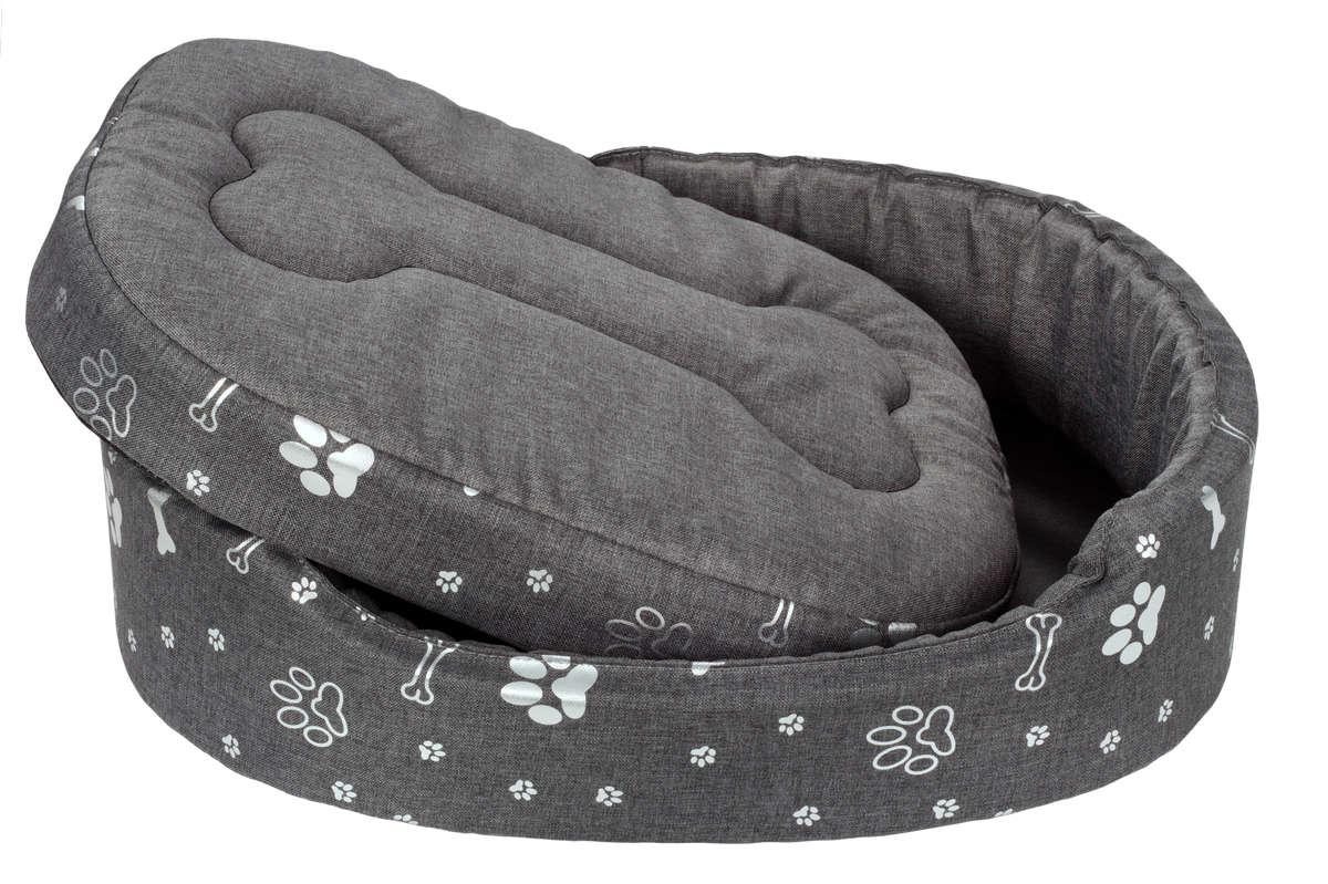 Owalne legowisko kojec dla psa Welsti ciemny szary srebrne kości i łapki XL 80x67 antypoślizgowy